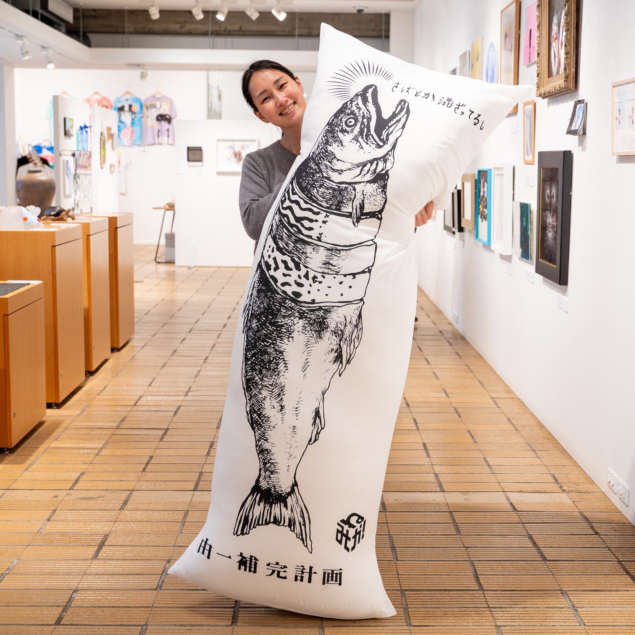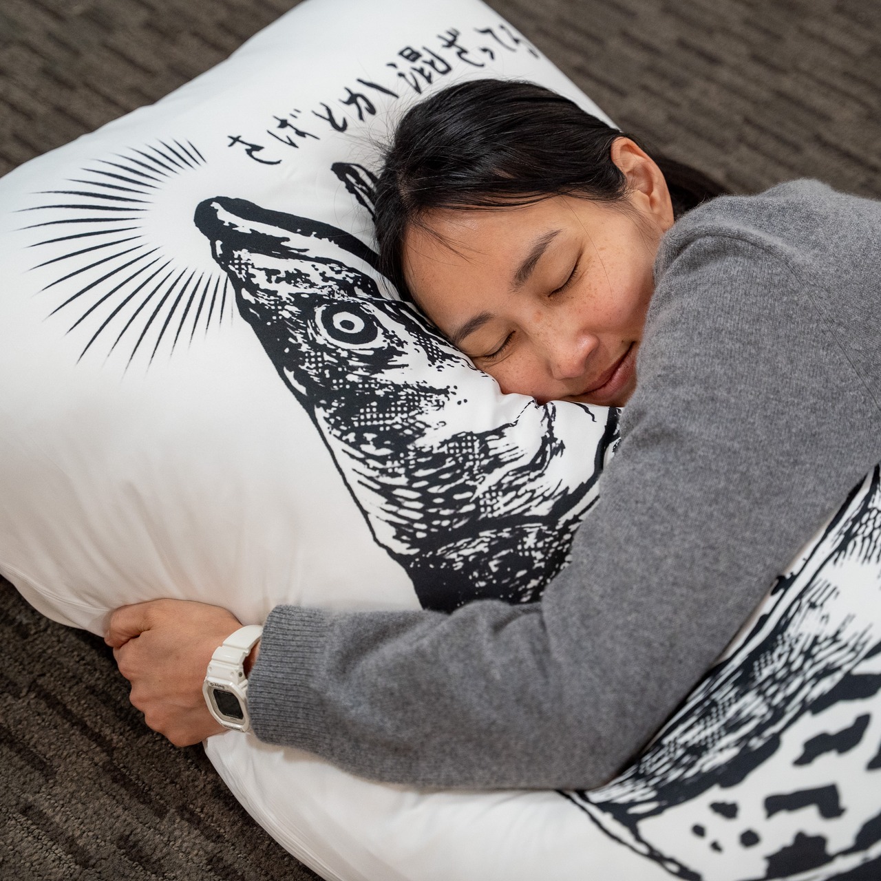 アイテムの名前として、「鮭を抱いて眠れ」ではなく「鮭に抱かれて眠れ」と名付けました。実際に抱いて横になってみると、あまりの巨大さに、文字通り「鮭に抱かれている」感じがします。不思議な安心感を感じられるのは、切り身になった部分が補完されて鮭も安心しているからでしょうか。