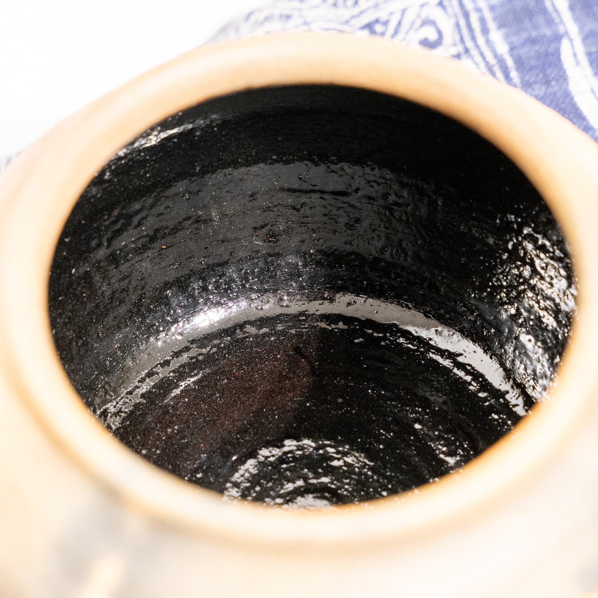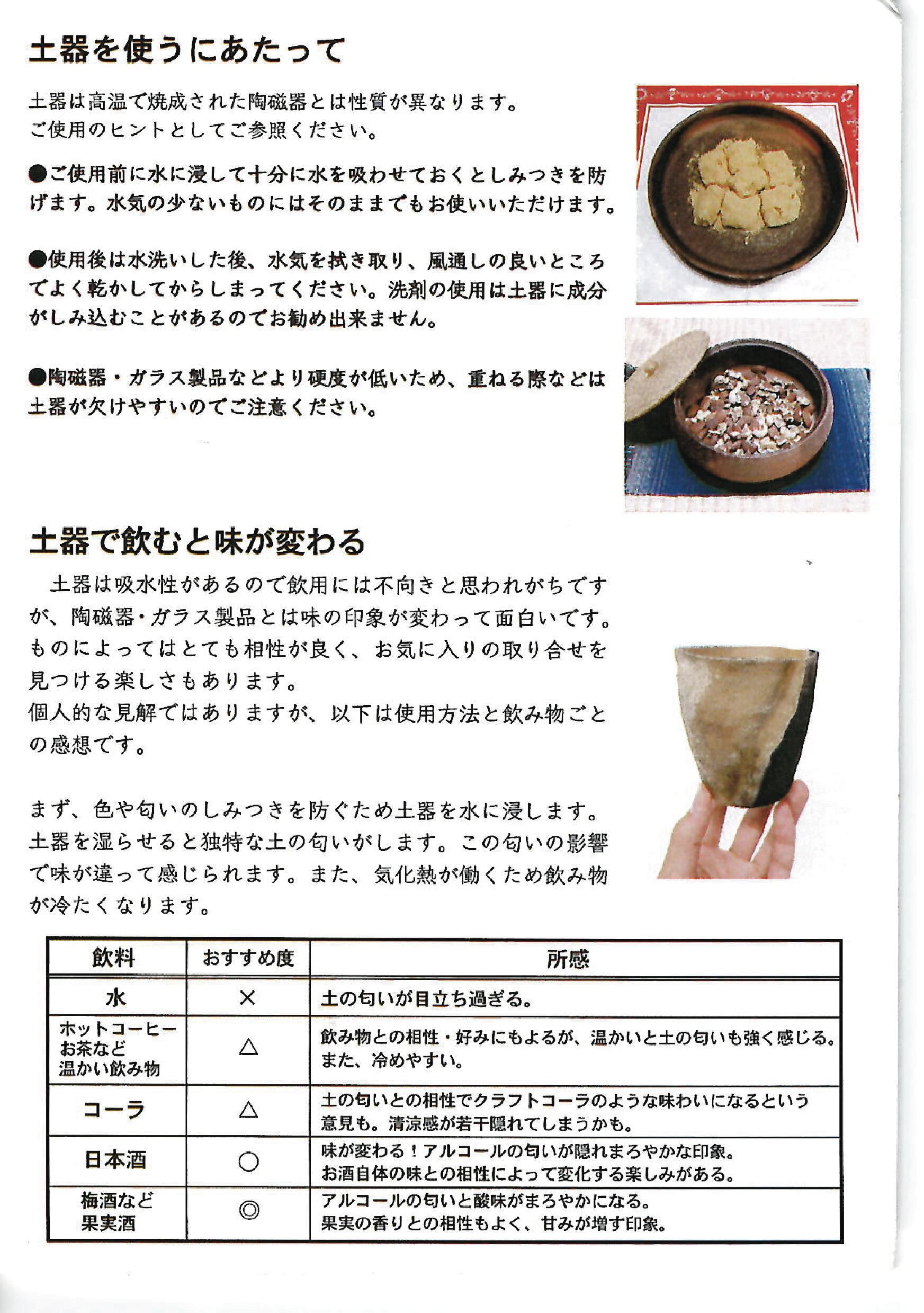 陶土(土器)、漆・轆轤成形、野焼き焼成、漆塗り(内側)