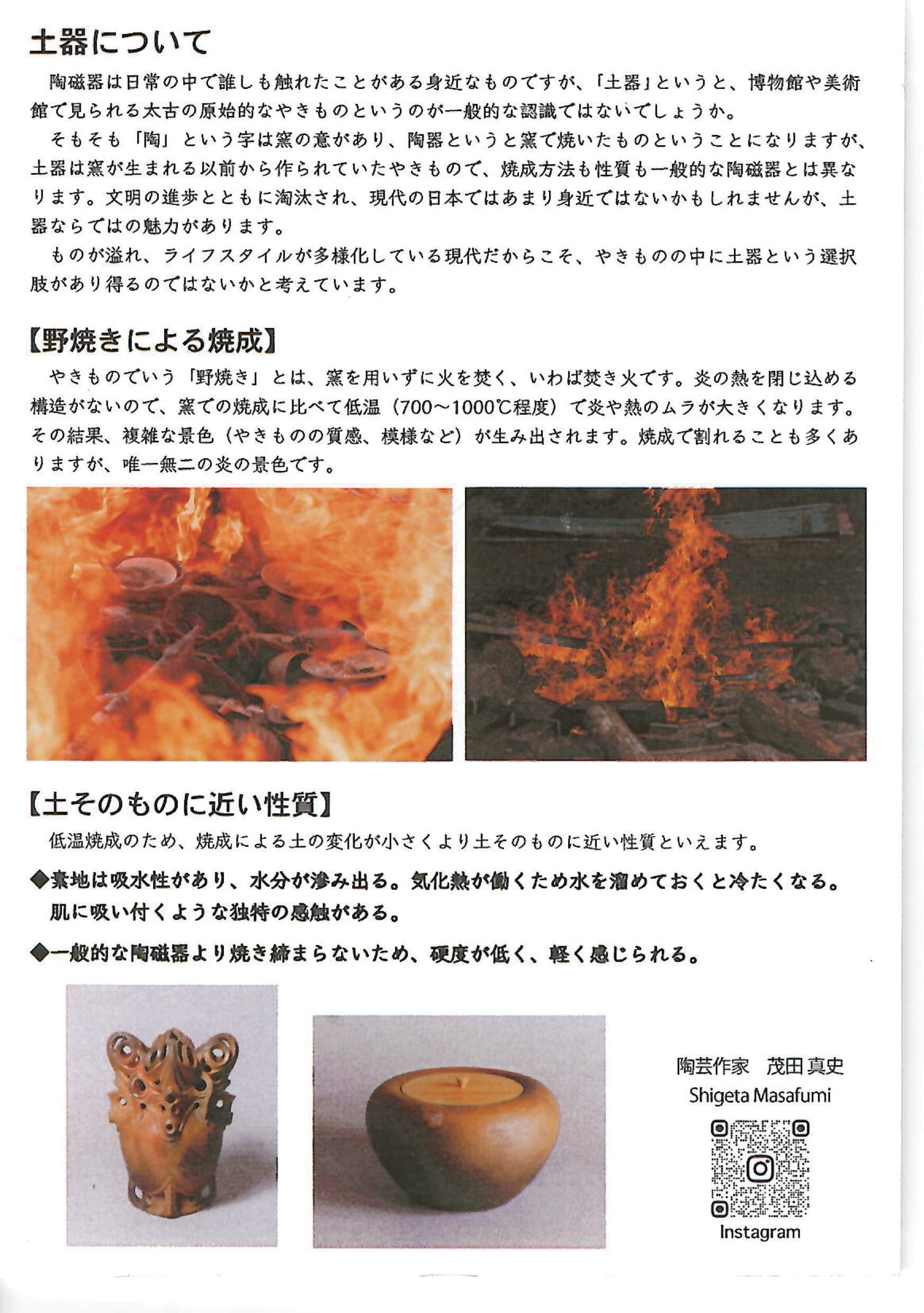 2018年から野焼きによる土器制作に取り組み、『制作における理性と野性』をテーマに作品制作・研究を行う。「制作行為には、思考に向かう理性的欲求と感覚に沿う野性的欲求が混在しているように思います。野焼きで炎と直に対峙している時、相反する理性と野性が一つの行為に統合し、同時に満たされることで制作行為に陶酔していくような感覚を覚えます」と作家は話す。土器作品の制作を通して人がものを作ることへの根源的欲求を探究しつつ、古物としての印象が強い土器を現代のやきものの選択肢として提示している。